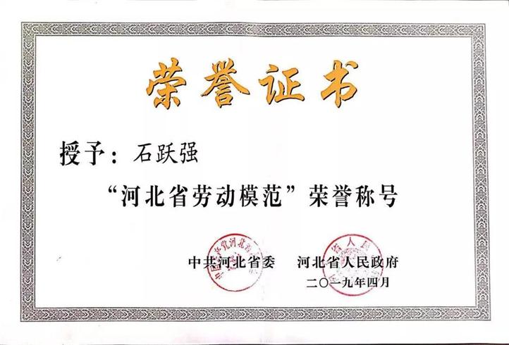 王啟良副主席在迎賓大廳宣讀了中共河北省委、河北省人民政府對(duì)石躍強(qiáng)同志的表彰決定,并與石總持獎(jiǎng)?wù)潞妥C書(shū)在普陽(yáng)辦公樓前廳合影留念。