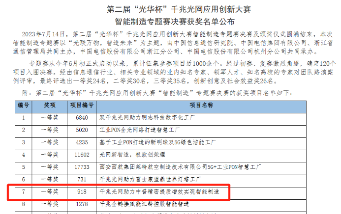 ?? “光華杯”千兆光網(wǎng)應(yīng)用創(chuàng)新大賽是工業(yè)和信息化部重要的年度賽事,旨在推動千兆光網(wǎng)技術(shù)在各個領(lǐng)域的創(chuàng)新應(yīng)用。本次智能制造專題賽經(jīng)歷了初賽、復(fù)賽和決賽三輪比拼,由信息通信行業(yè)及相關(guān)專業(yè)領(lǐng)域的知名專家、行業(yè)領(lǐng)軍人才、知名大學(xué)教授等嚴(yán)格評審,中普精密的項目在120個決賽項目中經(jīng)過激烈的競爭脫穎而出,獲得了專家的高度認(rèn)可。