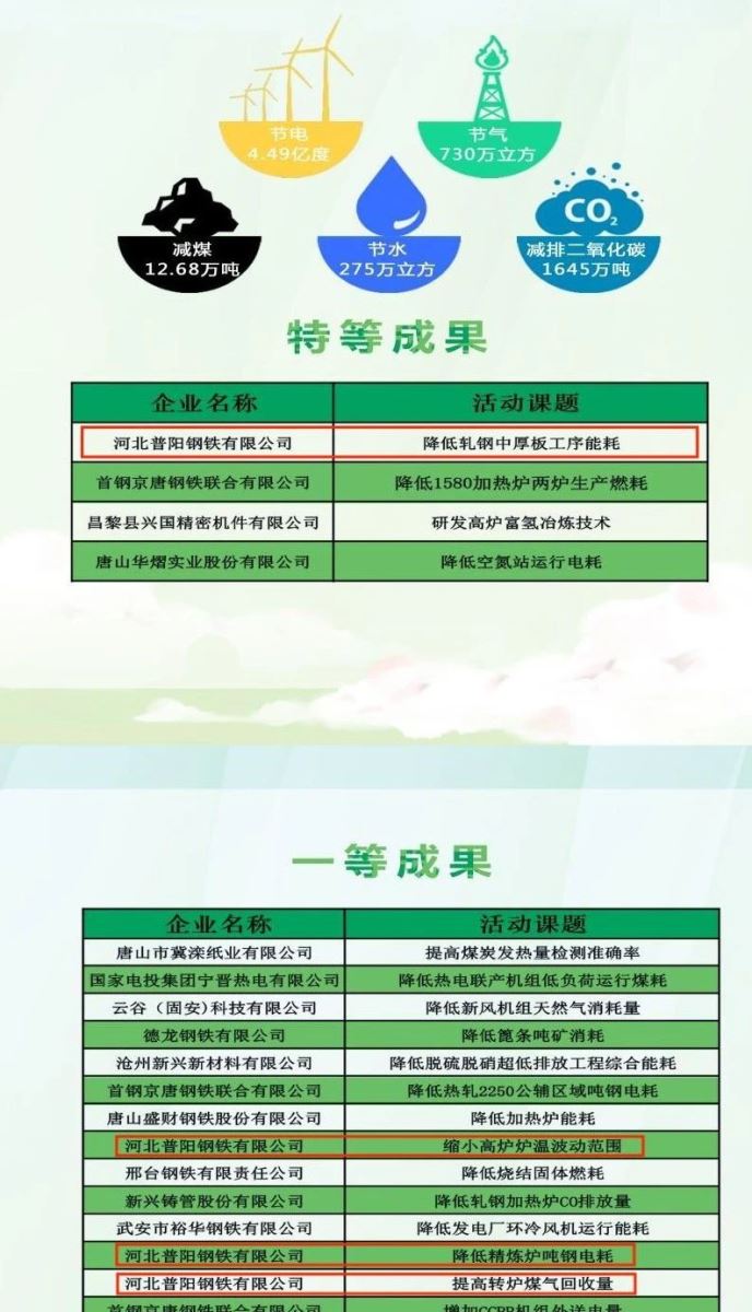 ? ? ? 本次征集活動(dòng),堅(jiān)持全員參與、注重實(shí)效、促進(jìn)交流的原則,采用自主申報(bào)、推薦等方式,共征集業(yè)績(jī)成果169項(xiàng),主要涉及節(jié)能、節(jié)水、二氧化碳和重點(diǎn)污染物減排等方面,經(jīng)行業(yè)專家評(píng)審,評(píng)出特等成果4項(xiàng),一等成果30項(xiàng),二等成果45項(xiàng)。其中,河北普陽(yáng)鋼鐵有限公司(以下簡(jiǎn)稱“普陽(yáng)”)提交的降低軋鋼中厚板工序能耗課題獲評(píng)特等成果,縮小高爐爐溫波動(dòng)范圍、降低精煉爐噸鋼電耗以及提高轉(zhuǎn)爐煤氣回收量3項(xiàng)課題被評(píng)為一等成果。據(jù)不完全統(tǒng)計(jì),本次評(píng)定的成果應(yīng)用經(jīng)濟(jì)效益可達(dá)3.63億元/年。年節(jié)電4.49億kWh、節(jié)氣730萬(wàn)m3、減煤12.68萬(wàn)t、壓采地下水275萬(wàn)m3、減排CO21645萬(wàn)噸,大幅削減重點(diǎn)污染物排放。
