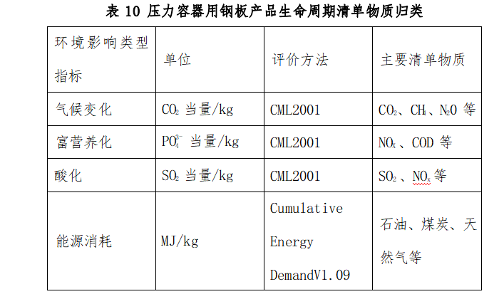 ? 根據(jù)清單物質(zhì)的物理化學(xué)性質(zhì),將對(duì)某影響類型有貢獻(xiàn)的物質(zhì)?歸到一起,例如,將對(duì)氣候變化有貢獻(xiàn)的二氧化碳、甲烷、氧化亞?氮等清單物質(zhì)歸到酸化影響類型里面。壓力容器用鋼板評(píng)價(jià)所用環(huán)境影響類型指標(biāo)及其主要清單物質(zhì)見(jiàn)表?10。