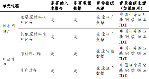 ? 本報(bào)告對(duì)系統(tǒng)邊界的所有過(guò)程進(jìn)行清單分析,包括所有能源、原材料和主要輔材的輸入,大氣、水體和固廢的排出等,部分消耗?量小于總消耗量?0.1%的輔材本報(bào)告中予以忽略?,F(xiàn)場(chǎng)數(shù)據(jù)均為本公司近?1?年內(nèi)的有效數(shù)據(jù)平均,背景數(shù)據(jù)以代表本國(guó)生產(chǎn)平均的數(shù)據(jù)優(yōu)先進(jìn)行采集。