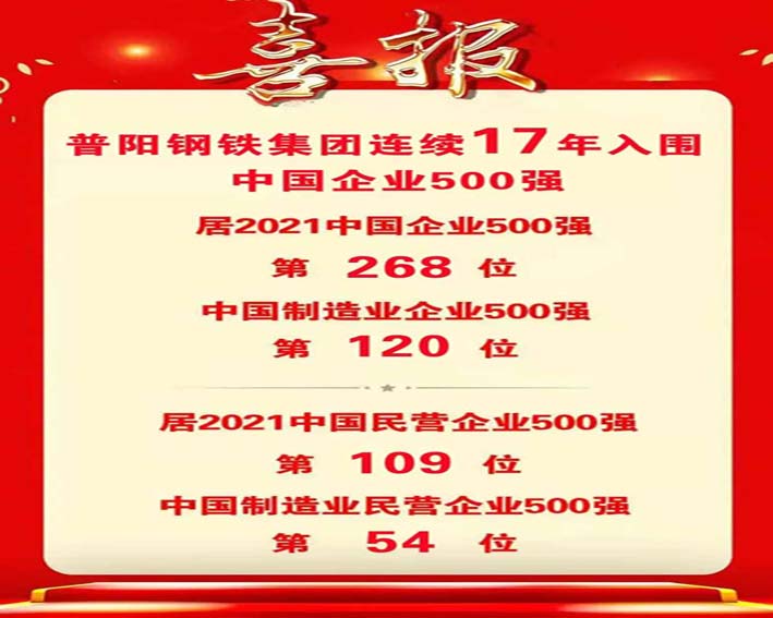 ?????? ?普陽鋼鐵集團(tuán)以2020年銷售收入791億元,居2021中國企業(yè)500強(qiáng)第?268?位,中國制造業(yè)企業(yè)500強(qiáng)第120?位,連續(xù)17年入圍中國企業(yè)500強(qiáng);居2021中國民營企業(yè)500強(qiáng)第109位,中國制造業(yè)民營企業(yè)500強(qiáng)第54位。???????????????????????????????????????????????????????????
