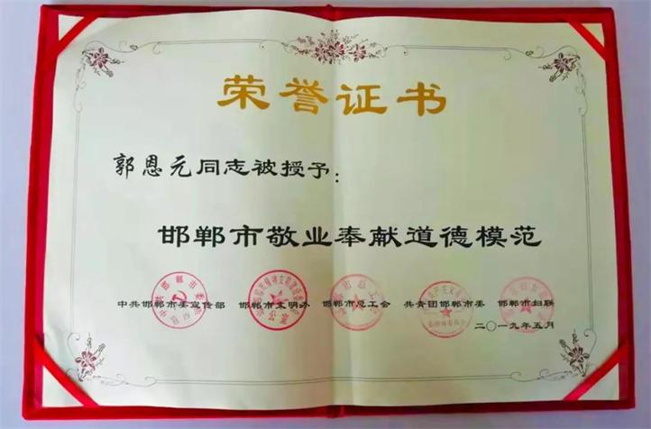 近日,由邯鄲市委宣傳部、市文明辦、市總工會(huì)、團(tuán)市委、市婦聯(lián)聯(lián)合舉辦的“邯鄲市第七屆道德模范頒獎(jiǎng)典禮暨2019年度新時(shí)代好少年先進(jìn)事跡發(fā)布會(huì)”,在市廣播電視臺(tái)演播大廳舉行。會(huì)議表彰了對(duì)推進(jìn)全市精神文明建設(shè)做出突出貢獻(xiàn)的企事業(yè)單位和個(gè)人,全國十大杰出企業(yè)家、全國鋼鐵工業(yè)勞動(dòng)模范、普陽鋼鐵集團(tuán)黨委書記、董事長(zhǎng)郭恩元榮獲“邯鄲市敬業(yè)奉獻(xiàn)道德模范”榮譽(yù)稱號(hào)。