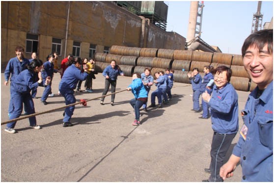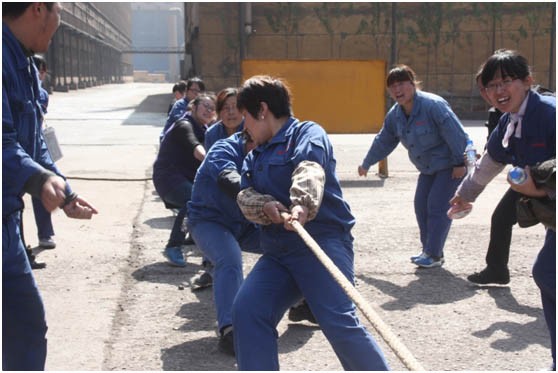 2013年“五一”前夕,質(zhì)管部在新區(qū)高線場(chǎng)地舉行了女子拔河比賽。質(zhì)管部部長(zhǎng)王巧林(右二)到場(chǎng)為大家加油助威。