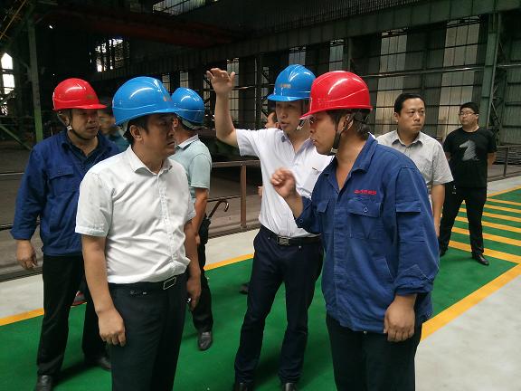 7月28日上午,武安市政府副市長(zhǎng)馬曉斌、環(huán)保局張文慶、陽(yáng)邑鎮(zhèn)楊貴寶等領(lǐng)導(dǎo),到我公司調(diào)研2017年大氣污染綜合整治項(xiàng)目實(shí)施進(jìn)度情況。公司總經(jīng)理石躍強(qiáng)、副總經(jīng)理李成安、環(huán)??崎L(zhǎng)李劍春陪同調(diào)研。圖為公司總經(jīng)理石躍強(qiáng)陪同馬曉斌副市長(zhǎng)參觀中厚板車(chē)間美化、亮化工程改造情況。